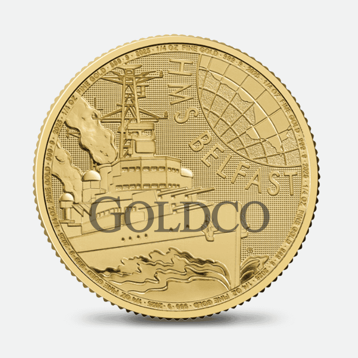 Goldco is proud to offer this 2025 gold HMS Belfast coin. Each coin is struck by The Royal Mint from ¼ oz. of 99.99% pure gold. This gorgeous coin features the effigy of King Charles III on the obverse. The reverse showcases a detailed depiction of one of U.K.'s most formidable warships as it has appeared since the 1960s.